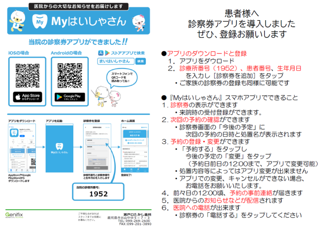 スマートフォンに「Myはいしゃさん」というアプリをダウンロードしてご利用いただくと便利です。